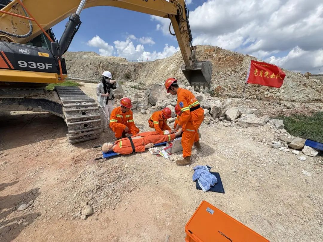 演练模拟2025年6月26日上午9点30分左右,潮州市龙燕矿业有限公司飞天燕瓷土矿项目部安全管理人员在暴雨过后开展排水系统专项检查,当巡查至1号运输道路边坡底部排水系统时,受“龙舟水”季节持续降雨影响,边坡突然发生坍塌,矿石滚落,此时,一名正在附近检查排水设施的安全检查工因躲避不及被矿石压住腿部,导致小腿骨折,无法动弹,情况紧急。事故现场人员在发现事故后立即向上级报告,企业收到事故报告后,立即启动相应的应急响应,相关负责人立即成立应急指挥部,有条不紊地指挥各个应急小组展开救援行动,成功救出受伤人员,最大限度地减少因事故造成的人员伤亡、财产损失。